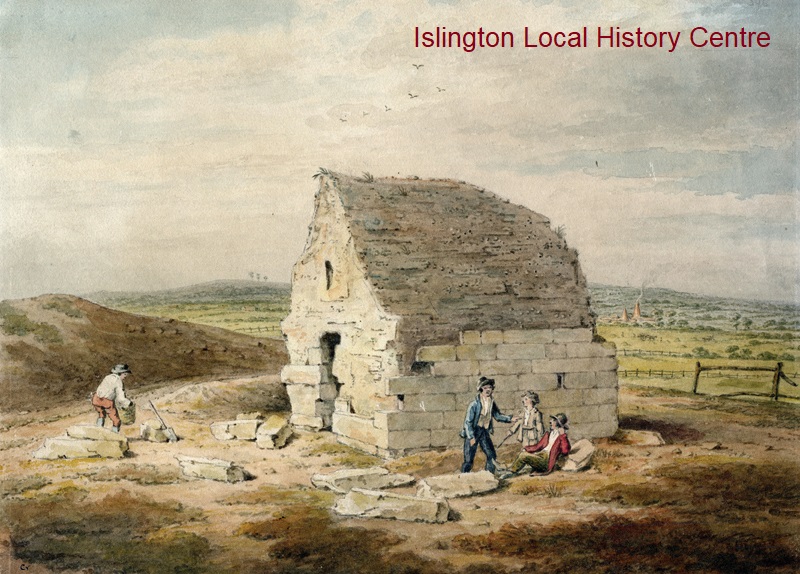 Group of locals outside the ruins of the old stone conduit in the grounds of White Conduit House (from which it took its name) built over leaden pipe water supply to Charterhouse (bearing the date 1641 with the initials of Thomas Sutton, its founder). The building 'was taken down by stealth on night to make room for houses' soon after this and used to repair part of the New Road. Chimneys of brick (or tile) kilns in the distance.