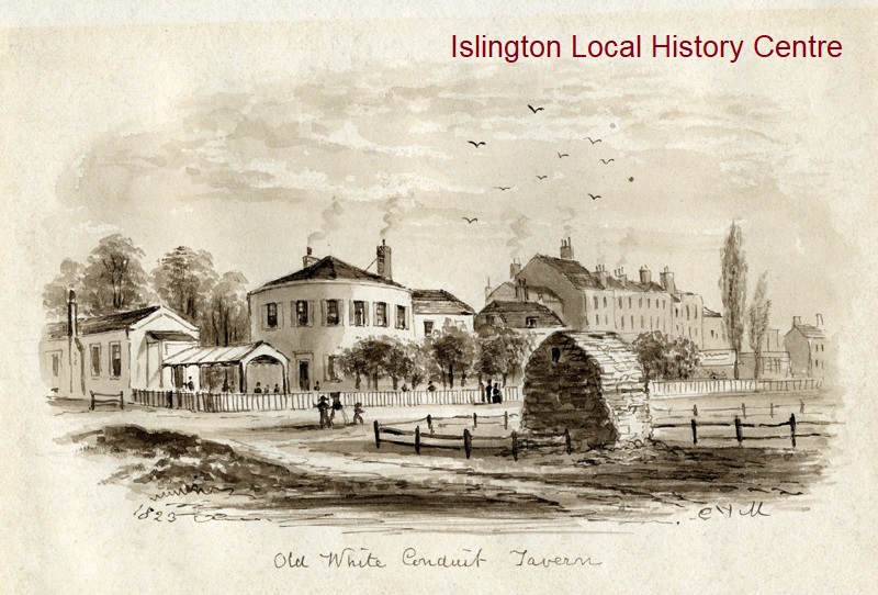 Pen and ink drawing of White Conduit House with the ruins of the old stone conduit (after which it is named) in the foreground. These were removed some years later.
