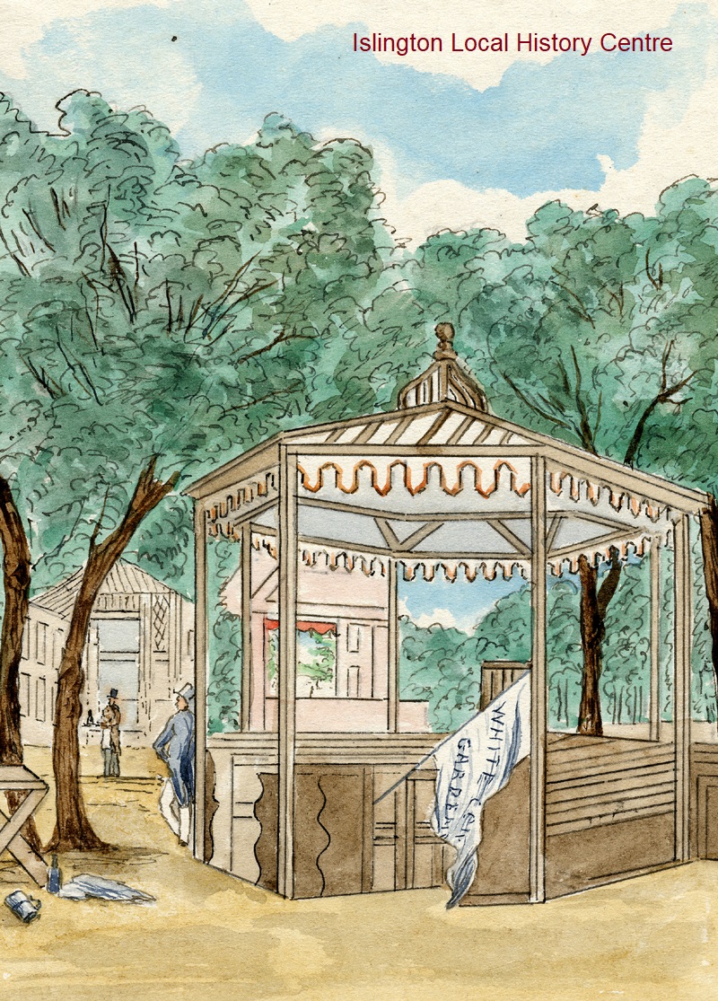 A corner of the gardens of White Conduit House while still a popular Cockney venue known as 'White Cundick Couse'. It became so disreputable it was closed and demolished in 1849