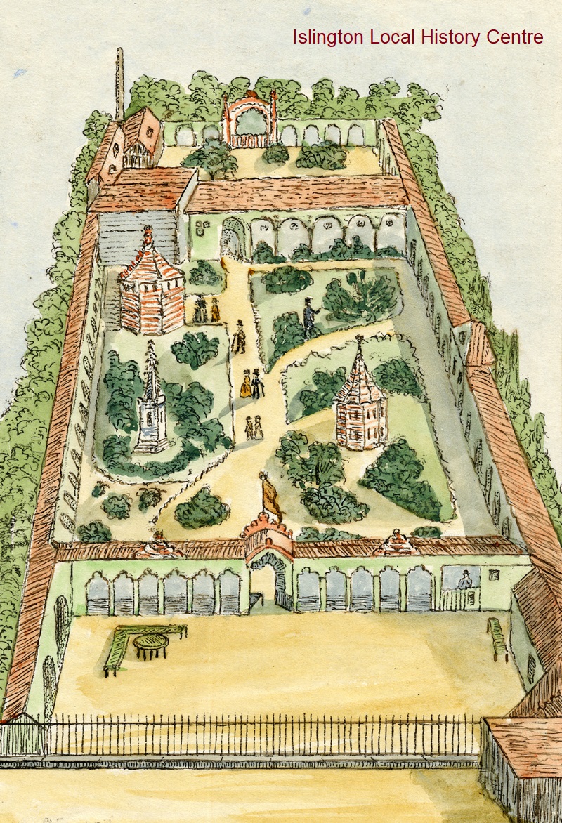 Bird's eye view looking over the gardens of the White Conduit House in Islington, taken from the balcony showing the ornaments, garden huts, pathways and surrounding arcade, before being demolished in 1849 when they had become very disreputable.