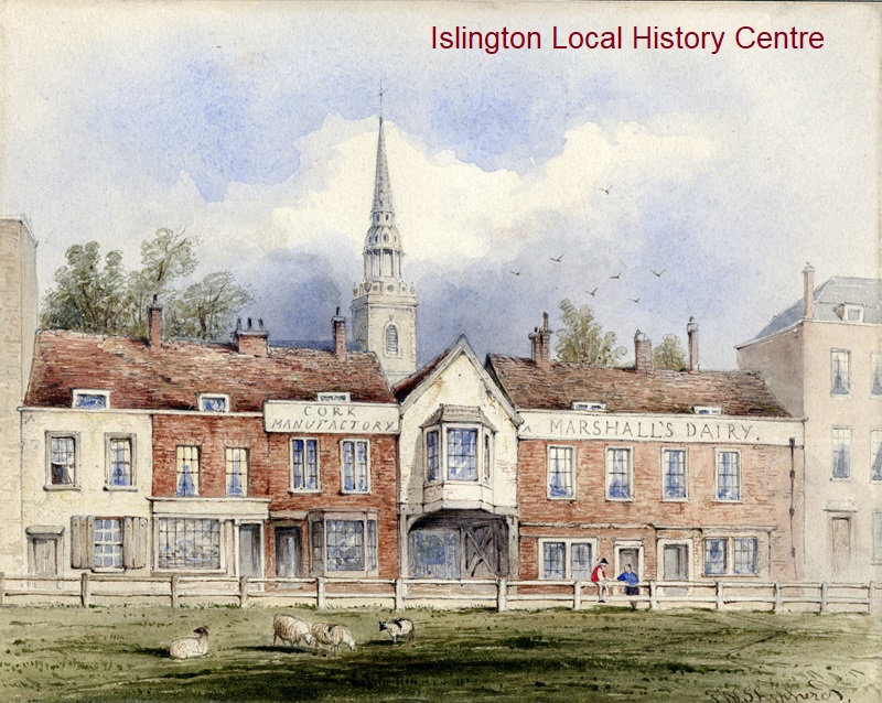 View of the White Hart Inn from Islington Green where sheep graze, also showing a cork manufactoary and the premises of Marshall's Dairy, St Mary's church steeple behind. The annotator notes that the buildings are pulled down and houses built on the site, 'with Comfort the butcher having a shop there'.