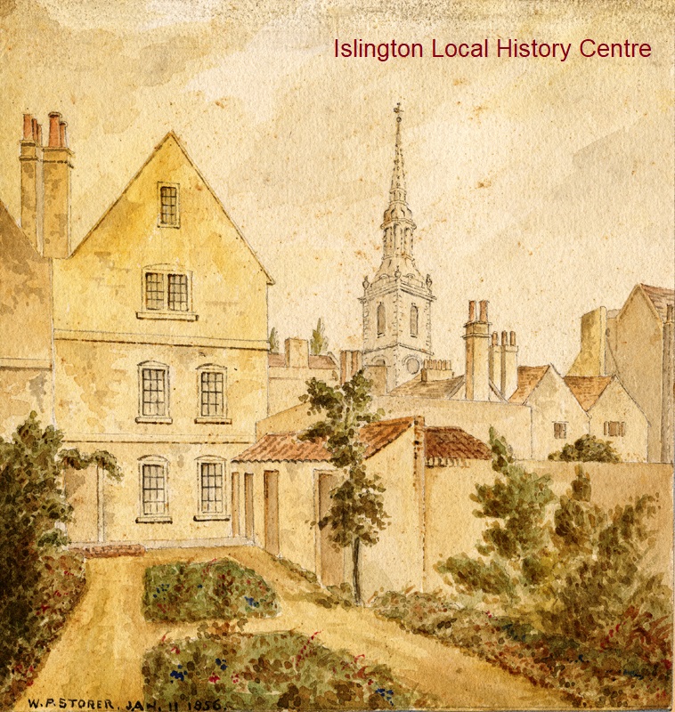 St Mary's Church spire seen from Mr Upcott's house and garden on Upper Street, after the watercolour by Shepherd.