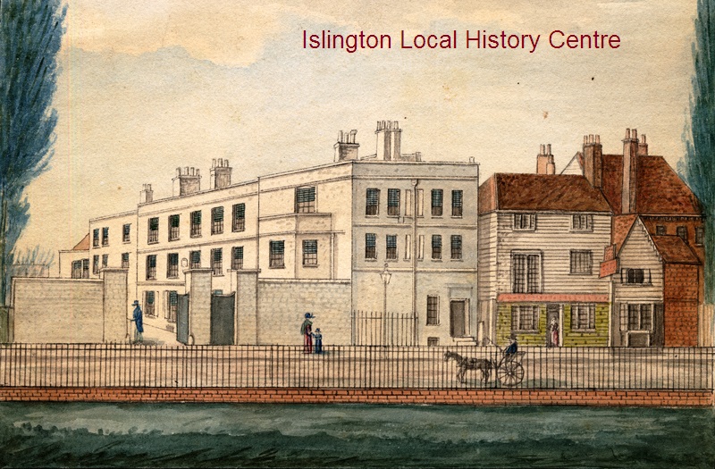 Watercolour of Church Missionary College, formally Harvey's, with cart and pedestrians in foreground.