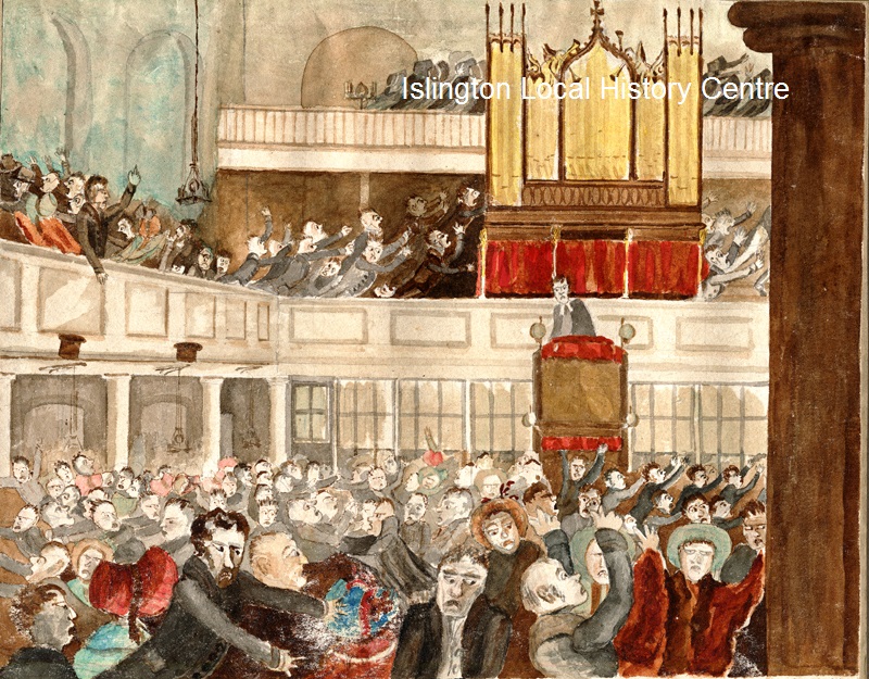 Old Islington Chapel, Church Street (now Gaskin Street), Islington. Drawing features congregation panicking upon the alarm of fire