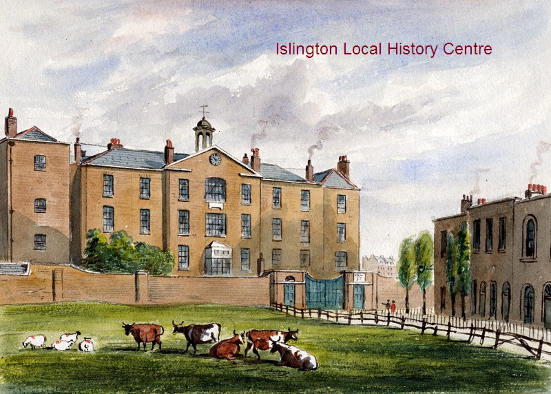 View of the parish workhouse next to a Georgian terrace and a field of cows.