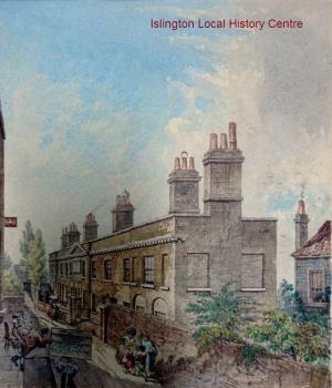 Street activity outside an imposing pedimented row of Almshouses built in 1794 by Mrs Jane Davis with money left by her husband, John Davis, an Islington carpenter (as indicated on a placard carried by one of the locals)