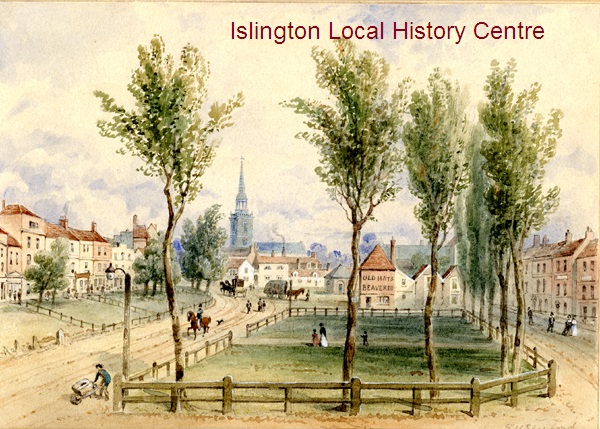 Islington High Street and Upper Street looking North towards St Mary's church across Islington Green and the parish lock-up