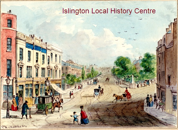 Busy street view by the junction with Goswell Road, many people walking and some horse-drawn transport. The original Blue Coat Boy is said to have been built in 1636. The later building was demolished in the late 1980s