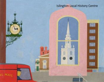 Mid twentieth century painting of architectural details around Finsbury and Clerkenwell including the Town Hall clock, Sessions House pediment, St James's church spire and a Royal Mail delivery van.