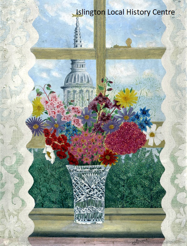 Still life painting of a (Waterford crystal?) vase of garden flowers on the sill of a window edged by lace curtains and the spire of St Mary's Church behind.