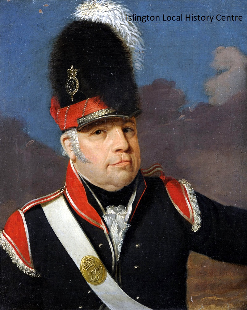 The astronomer Alexander Aubert (1730-1805) Fellow of the Royal Society 1772. In 1788 bought Highbury House, Highbury Hill for 6000 guineas and built a rotating observatory there. In 1797 he organised, and was appointed lieutenant-colonel of, the 'Loyal Islington Volunteers.' Buried at St Mary's. He is shown in uniform.