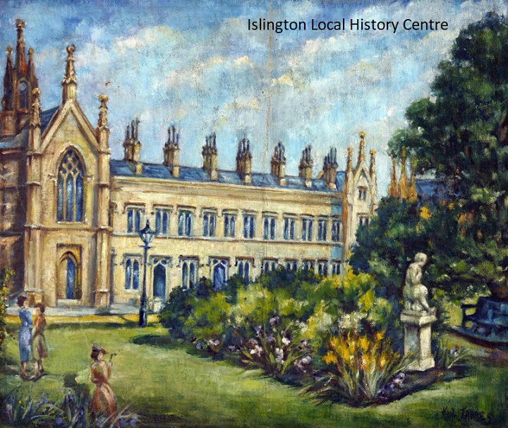 Almshouses in the complex of Gothic Revival almshouse buildings and landscaped gardens built 1822-4 by George Smith for the Mercers' Company, demolished 1967 to widen Archway Road.