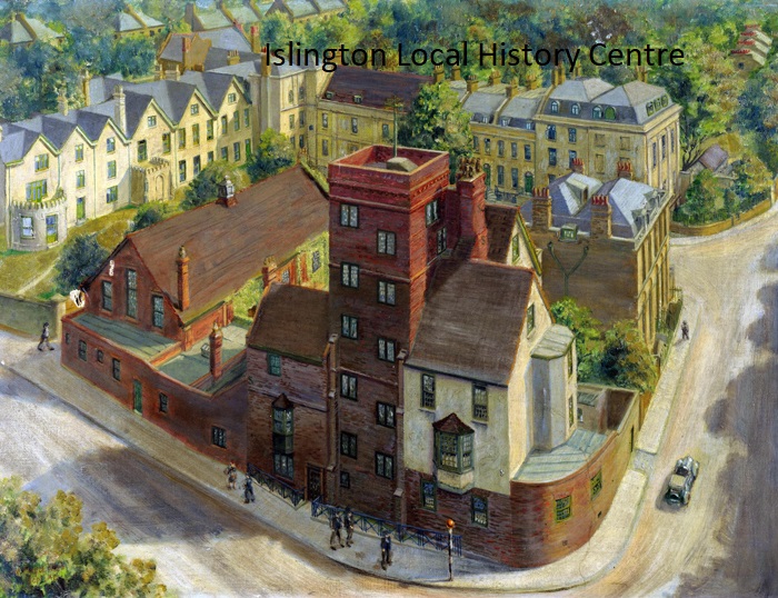 Aerial view of street activity by Canonbury Tower at the corner of Canonbury Place and Alwyne Villas with the terrace of Alwyne Place behind.