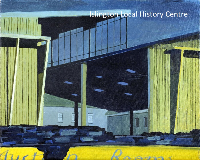 Charles Frederick Anderson set up as a timber dealer renting land on Lower Street in 1863 and the business thrived, supplying board to the film industry and Festival of Britain. Rebuilt after a massive fire in 1958 it incorporated neighbouring Collins's Music Hall but was sold by the family for redevelopment around the time of this painting (one of four) which shows the timber yard derelict but with some wood remaining and an Auction Rooms sign in the foreground