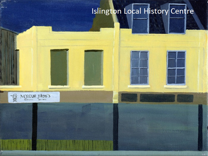 Charles Frederick Anderson set up as a timber dealer renting land on Lower Street in 1863 and the business thrived, supplying board to the film industry and Festival of Britain. Rebuilt after a massive fire in 1958 it incorporated neighbouring Collins's Music Hall but was sold by the family for redevelopment around the time of this painting (one of four) which shows houses and empty shops on Essex Road with the timber yard roof behind