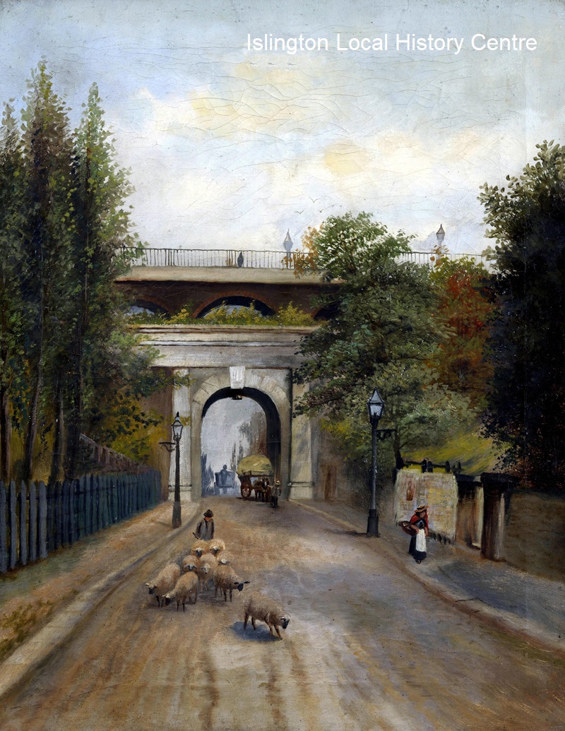 'Highgate' Archway designed by John Nash and opened in 1813, looking North with sheep being driven towards the city