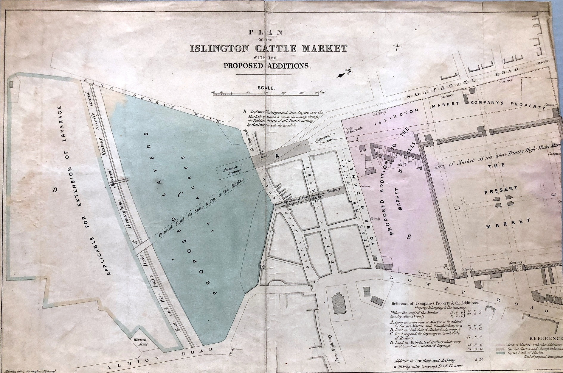 Plan of additions proposed for John Perkins' large cattle market on Lower Road completed in 1836, but as traders preferred Smithfield his venture failed in 1837. Bought by speculators c.1847 and reopened 1849 but closed early 1850s, when the land was laid out for building.
