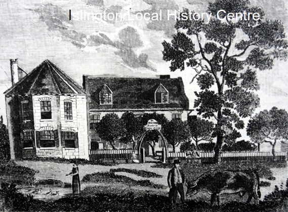 Copenhagen House with a woman feeding ducks at the pond, a man with a cow and other visitors. The name above the gate is Thomas Tooth who was landlord c.1810-17. Fighting matches took place between bulldogs and bull-baiting on Sundays which caused his licence to be withdrawn.