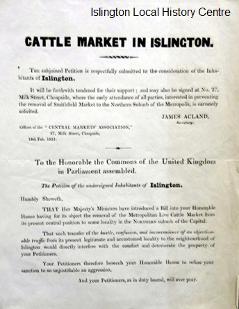 Parliamentary petition against removal of Smithfield Market to Islington on the grounds that 'objectionable traffic' would 'interfere with the comfort and deteriorate the property of your petitioners'