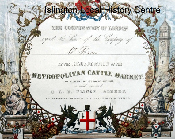 The Corporation of London's elaborate printed invitation to the opening which H.R.H. Prince Albert had 'graciously signified his intention' to attend. Decoration includes coat of arms for London and others, the clocktower, a fountain(planned but never built?) and agricultural elements.