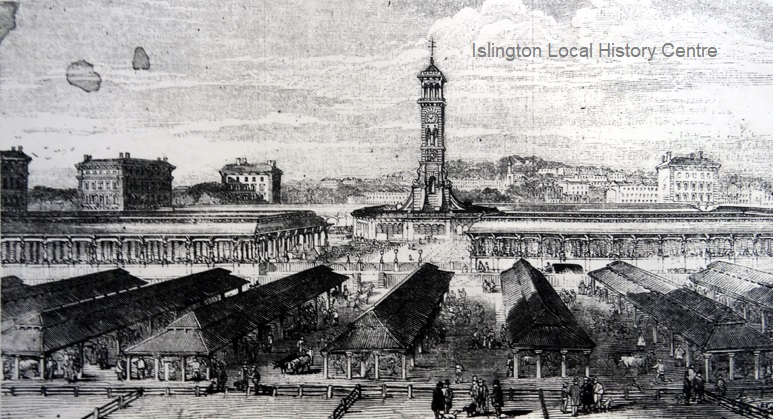 1855 Illustrated London News impression of the new Metropolitan Cattle Market entrance with the history of the site previously occupied by Copenhagen House (including engraving) and the relocation of Smithfield market.