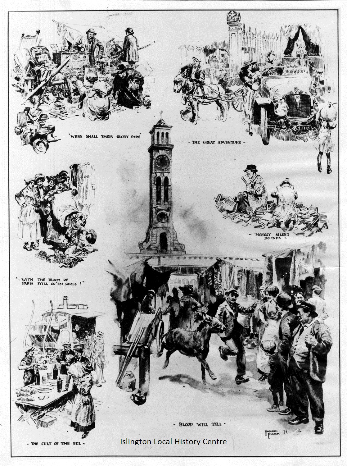 Engravings of the market showing sales of bric a brac, old clothes, books, donkeys and an eel stall