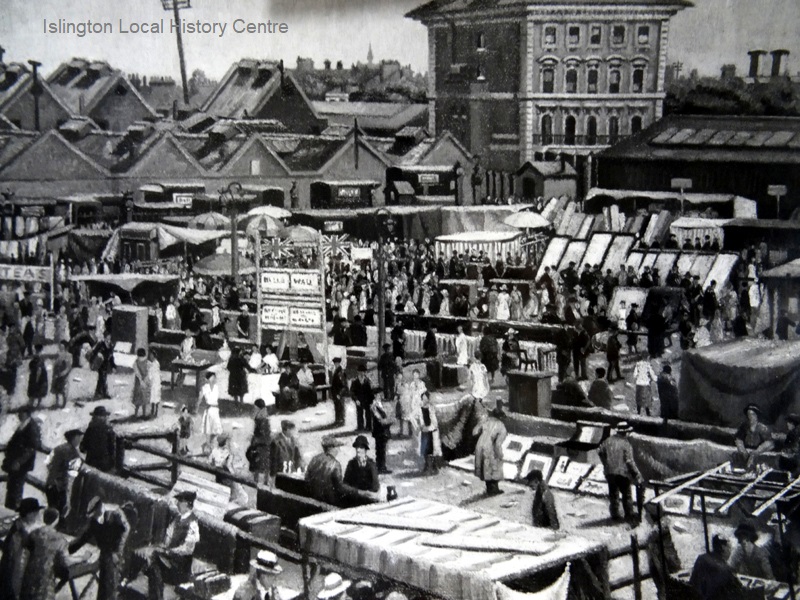 View over market showing many stalls selling bric a brac etc, pub and rooftops behind