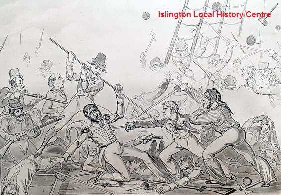 Plate 5 of 'The Progress of a Midshipman exemplified in the career of Master Blockhead' shows the midshipman killing a French sailor whose ship the English have boarded in an empty gesture. Based on the life of the English novelist Captain Frederick Marryat.