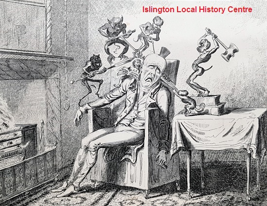 An elderly man in an armchair by the fire is tormented by six little devils who agitate his skull creating a massive headache