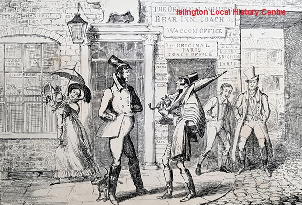 Two Frenchmen outside the White Bear in Piccadilly amuse Londoners by their English dress and speech: "Gode a Morning Sare, did it rain tow Marrow?—"Yase it vas"—.