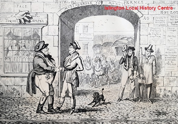 John Bull and another Englishman in Paris:"Commong porty vous Munseer?— and O Oui—il est un tres belle jour!"watched by amused Parisians.