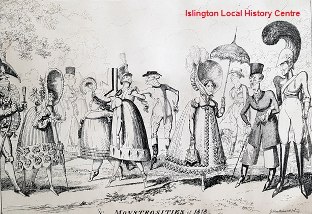 Dandies of both sexes promenading in London's Hyde Park wearing exaggerated fashions of 1817 - high waists, large hats