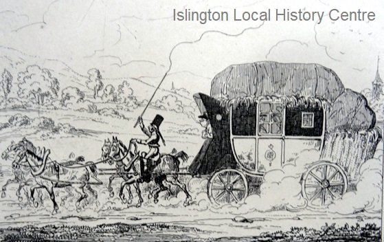 An old-fashioned diligence is driven by a postillion along a dusty country road, one of the passengers is smoking behind the horses.