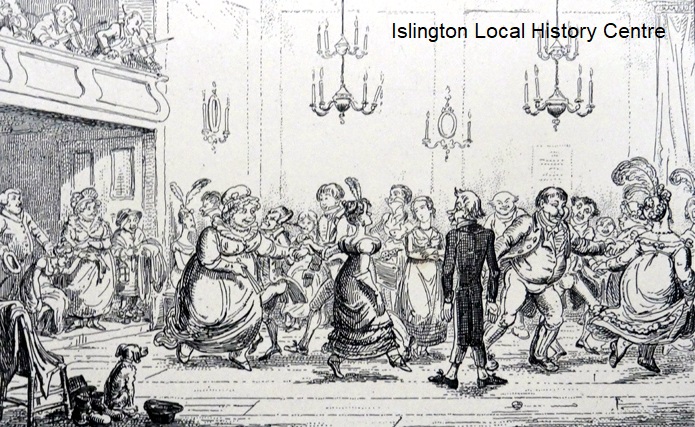 Dance in progress at provincial assembly room lit by candelabra and with a musicians' gallery