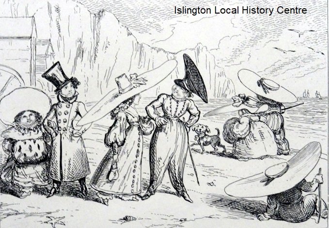 Small children in absurd adult fashions promenade along a beach with cliffs and bathing machines (Brighton?)
