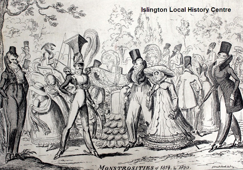 London Dandies promenading in Hyde Park wearing exaggerated fashions of 1819 & 1820, more extreme than previous years. Lord Petersham in the background drives a high gig while the Persian Ambassador is riding with his entourage.