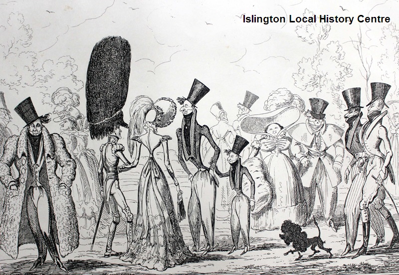 London Dandies of both sexes promenading in Hyde Park wearing exaggerated fashions of 1821, more extreme than previous years. Shoulders are broader, waists lower and even more pinched. A boy is dressed like his father and a poodle is fashionably clipped.