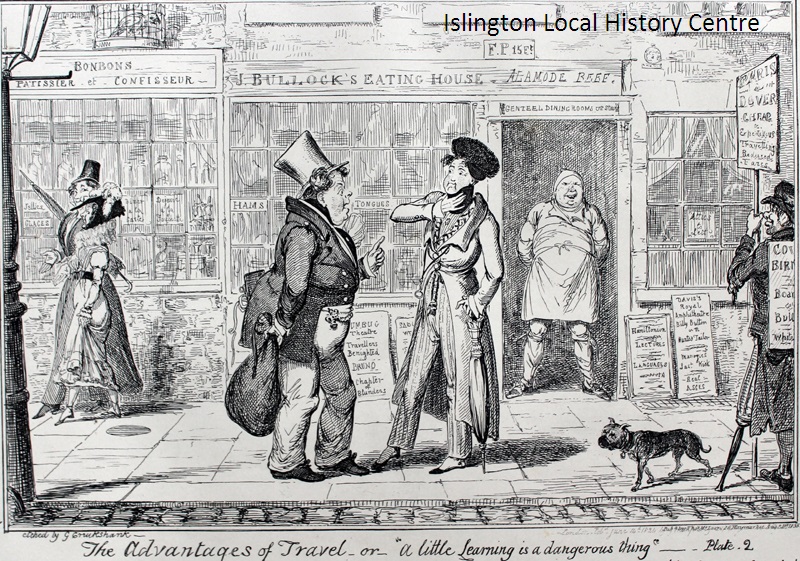 Two Englishmen outside Bullock's Eating House in London discuss recent travel to Paris and the food in France. The portly cook and passers-by are amused. A sweetshop advertises sweets in French and an English bulldog watches beside an old soldier holding a sandwich-board for the channel ferry.