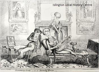 Three dandies in an elegant interior sing and play instruments. One admires himself in the mirror.