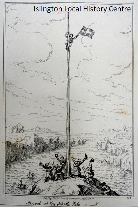 A sailor with a Union flag has climbed nearly to the top of a tall pole on a rock in a sea with icebergs. A group of sailors, wave their hats and Commander John Ross (1777-1856) leader of a voyage to explore the North-West Passage in 1818 climbs to join them.