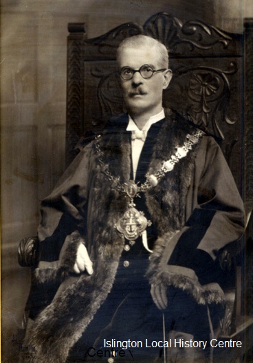 Sir William Edwin Manchester (1869-1956), Mayor of Islington 1929-30. Born in Holloway, dairyman for Express Dairy, later director. Justice of the Peace, Alderman 1909-19 and 1922-34. Islington representative to Metropolitan Water Board. He was knighted in 1936 for political and public service.