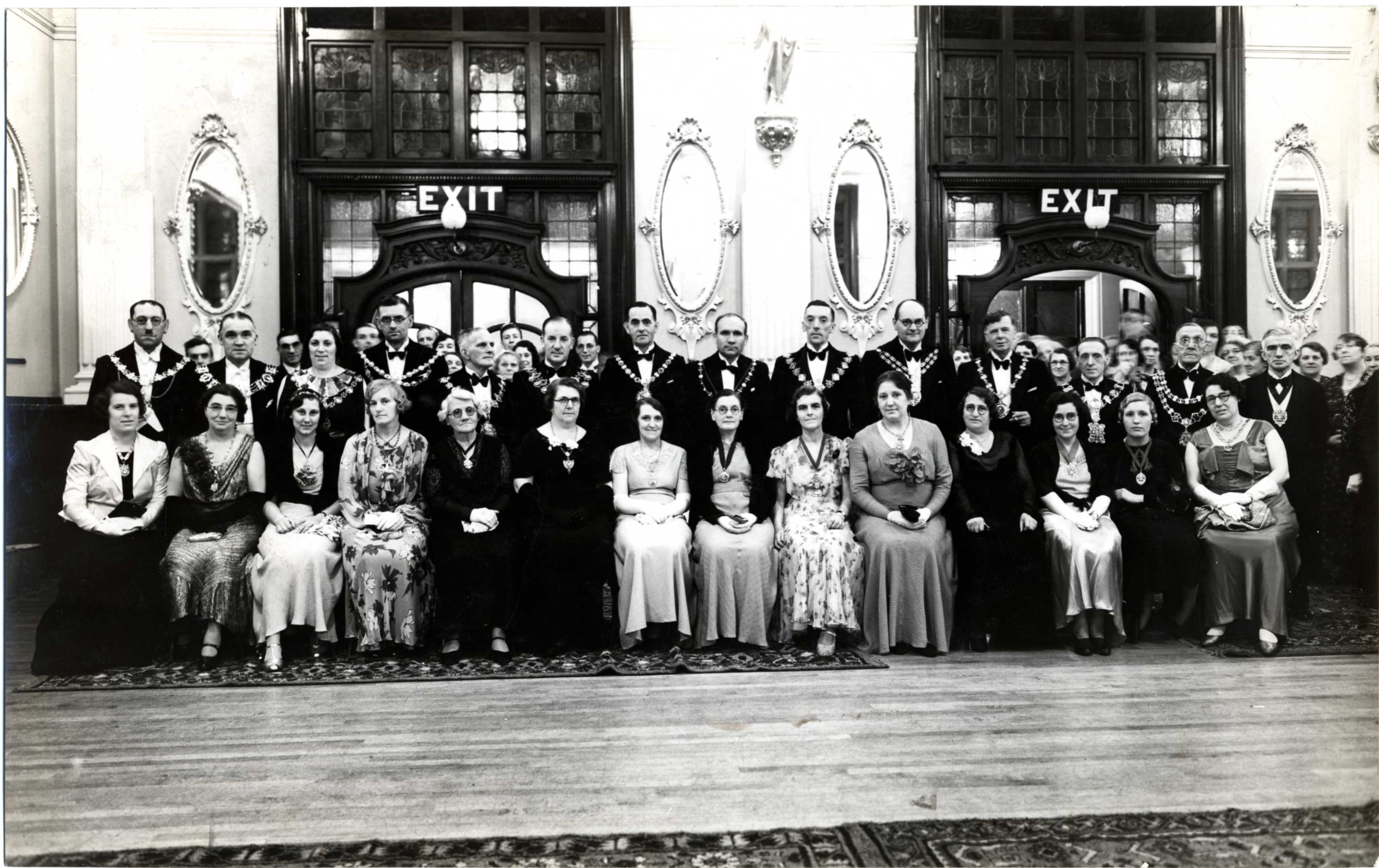 Charles Henry Simmons, train locomotive driver, twice Mayor of Finsbury 1934-35 and 1935-36, photographed in chain of office at a reception in Finsbury Town Hall with a line-up of other dignataries (some also with chains of office).