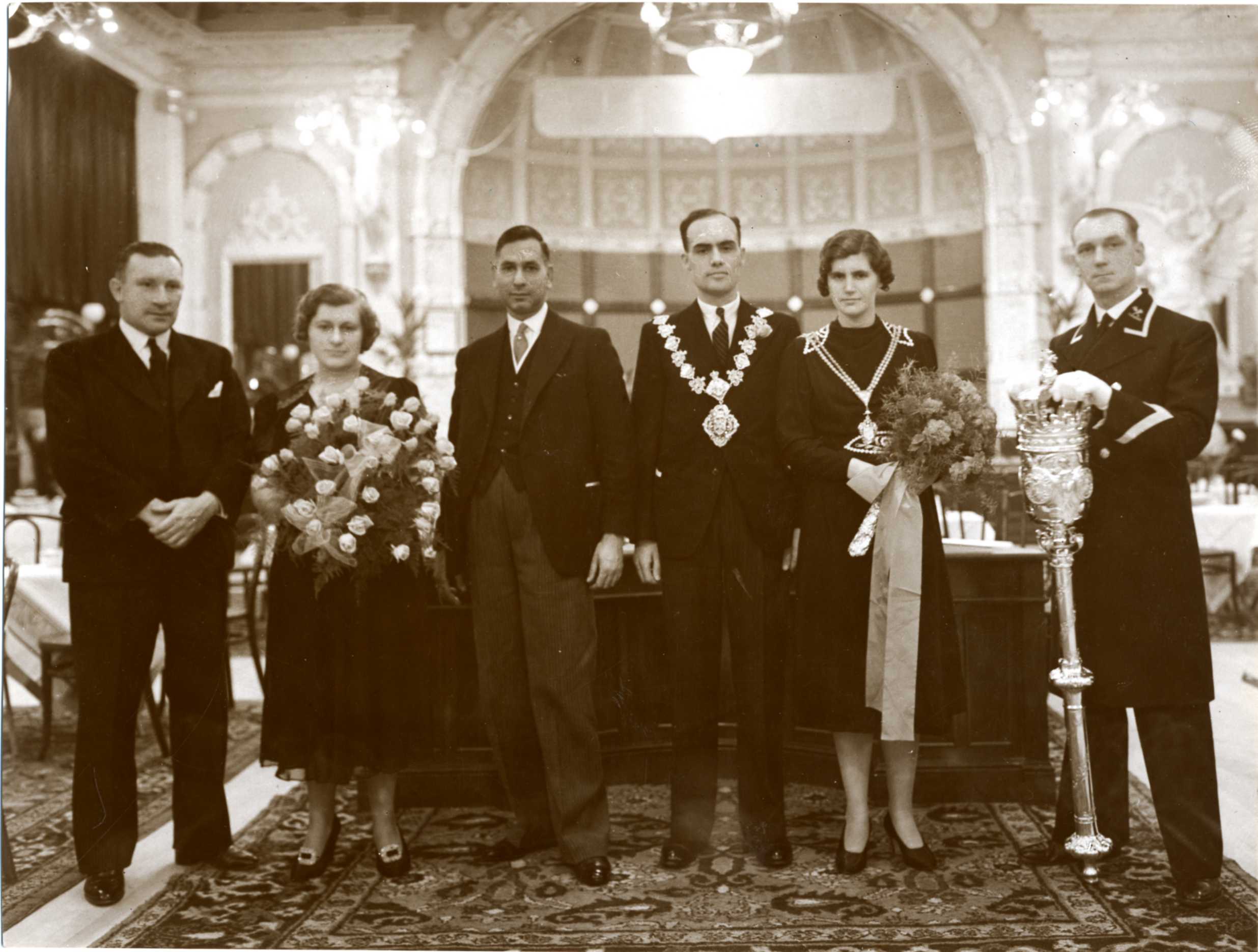 The Mayor of Finsbury 1939-40, William Lewis Prowse (1907-75), in the Large Hall at Finsbury Town Hall with Alderman Dr Chuni Lai, (1898-1978, Mayor of Finsbury 1928-39, first South Asian UK mayor) who presented a new chain of office for the mayoress. William Lewis Prowse was born in Islington and was a Labour councillor and alderman, representing Shoreditch and Finsbury on London County Council 1949-52. Photograph also includes the Town Clerk T.J. Wilson, Miss Madge Clarke and the Mayor's attendant W.Pearce with mace.