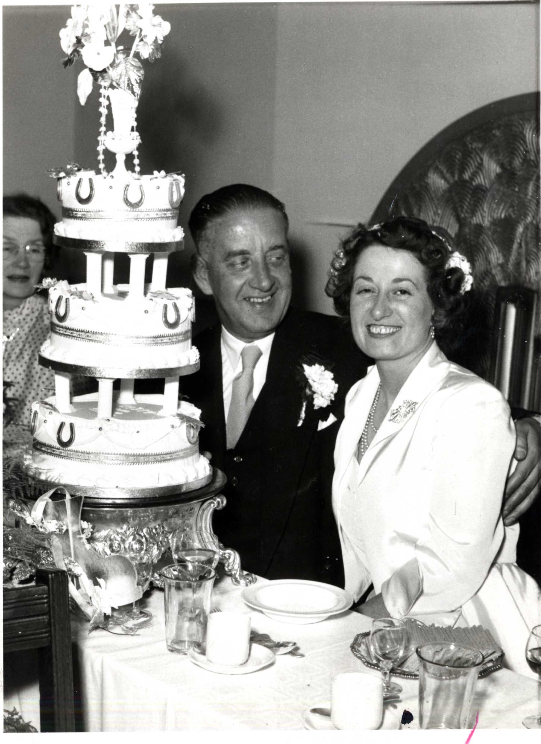 The Mayor of Finsbury 1952-53, Alderman Ernest Frederick Johnson, known as 'Mick' with bride at his wedding reception behind the cake.