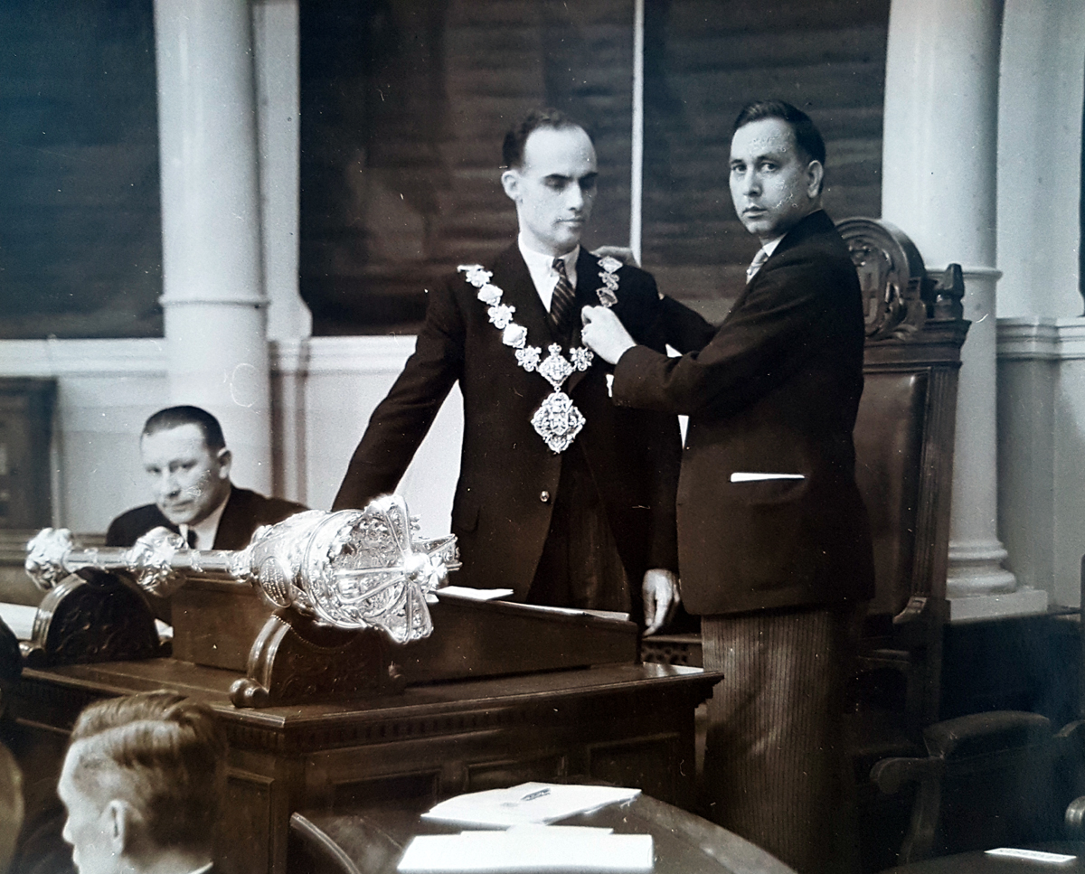 The Mayor of Finsbury 1939-40, Councillor William Lewis Prowse (1907-75) being invested at Finsbury Town Hall with chain of office by outgoing Mayor Alderman Dr Chuni Lai, (1898-1978, first South Asian UK mayor). William Lewis Prowse was born in Islington and was a Labour councillor and alderman, representing Shoreditch and Finsbury on London County Council 1949-52. Photograph also includes the Town Clerk T.J. Wilson and mace.