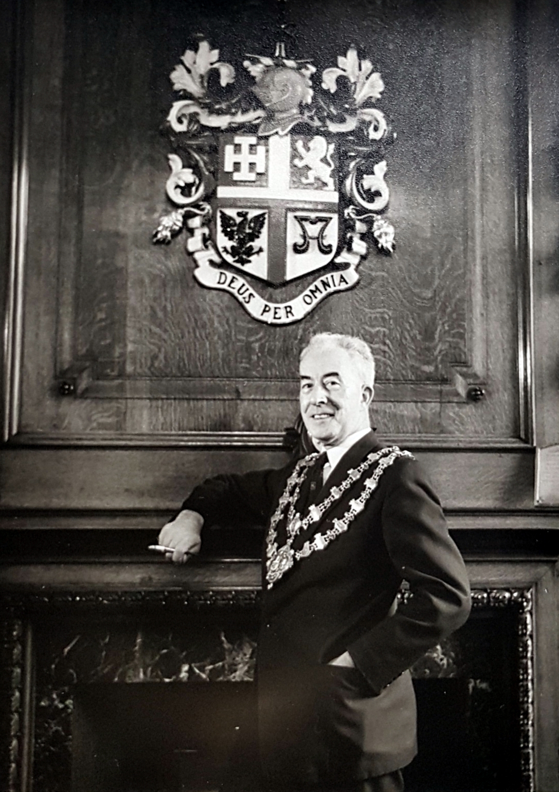 John Charles Barnes (died 1990), Mayor of Islington 1959-60. Labour Councillor for Upper Holloway 1937-59, Alderman 1959-65, Councillor St George's 1964-68. Justice of the Peace. Lived 1937 at 10 Prospero Road and 1945 at 102 Carleton Road. Member of North Islington Labour party for over 50 years and of the Libraries committee 1937-68. John Barnes Library on Camden Road was named after him and Barnes Court, Lofting Road. Photo in chain of office and cigarette by 'Deus per Omnia' coat of arms (God in everything) in Islington Town Hall Mayor's parlour.