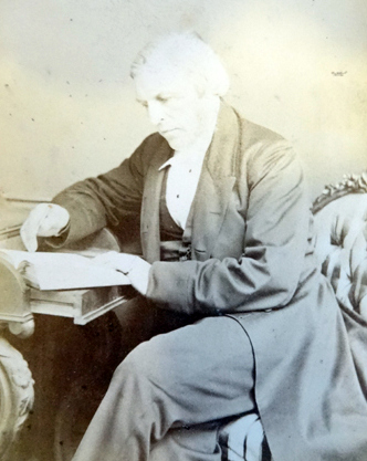 Rev Dr Henry Allon (1818-92), pastor of Union Chapel for 50 years, first as co-pastor after his ordination in 1844 and from 1852 as sole pastor. During his ministry the chapel was englarged (1876 by Cubitt) and rebuilt 1889. His services were known for their excellence mainly due to his musical talent. Lived at 10 St Mary's Road (now Grove) from 1849 to his death and kept and extensive library there. Seated at desk.