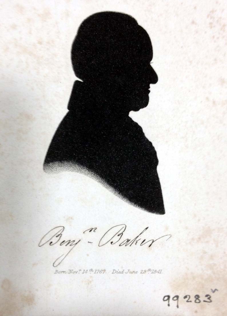 - NotesSilhouette 'Benjn Baker Born Nov 14th 1767 Died June 29th 1841), head and shoulders, foxed and badly trimmed. Lightly stuck to card.