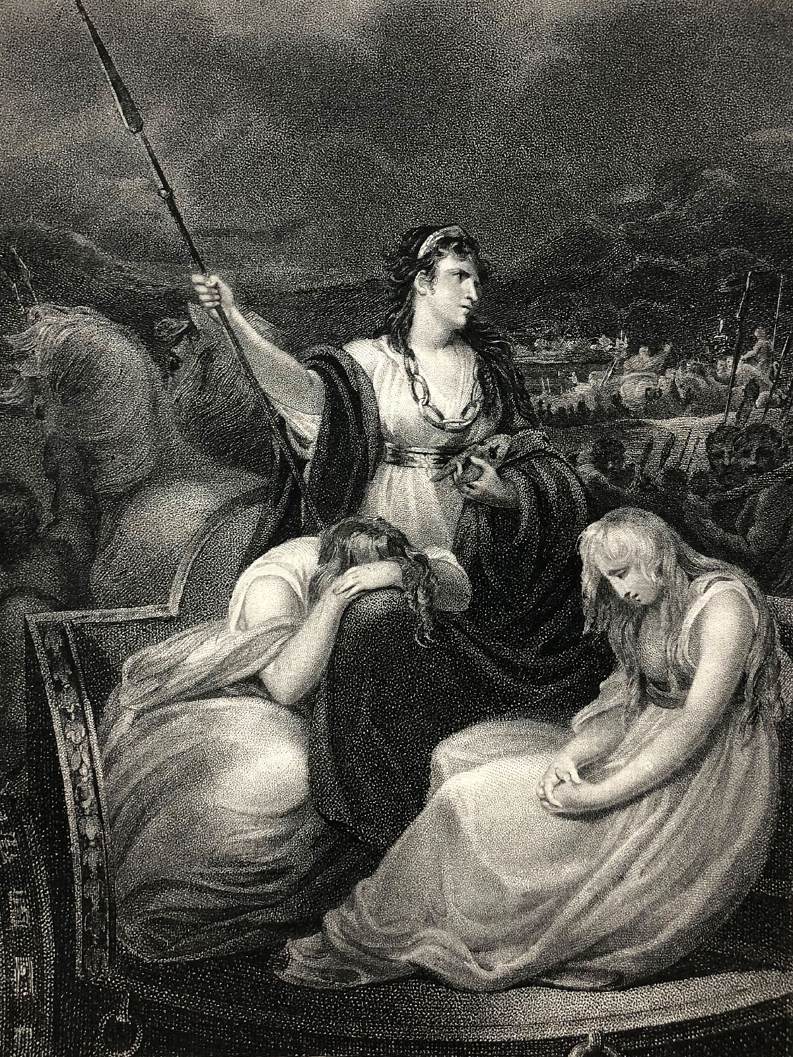 - NotesEngraved by William Bond after Henry Singleton. Caption reads 'Queen of the Iceni, leading the Britons against the Roman army under Suetonius. Seeing her troops defeated with the slaughter of 80,000 men, she terminated her life by poison in order to avoid falling into the power of the Roman General'