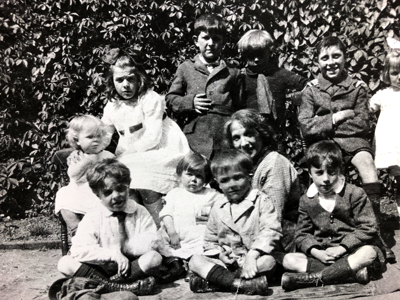 Brewster Family of 1 River Terrace (now River Place) identified as Fred, Lou, Mary, Winnie, Jessie?, Issac, Adams, Wally Beard and Scrivers (Scrivener?) boys photographed with their mother in a garden
